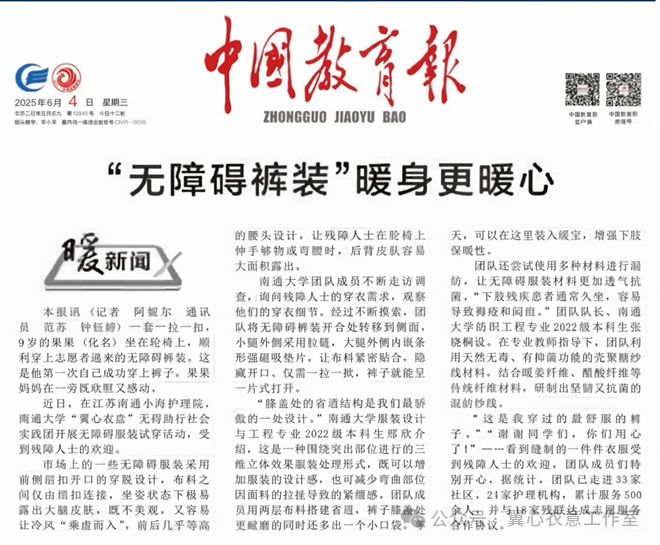 6 月,团队的无障碍助残故事被《中国教育报》重点关注并专题报道!报道中,9 岁轮椅男孩果果自主穿上无障碍裤装的暖心场景、团队走访 33 家社区和 24 家护理机构的实践足迹、用壳聚糖纱线研制抗菌服装的专业探索,都让高校青年扎根助残一线的担当被更多人看见,大幅提升了无障碍事业的青年传播力与社会影响力。