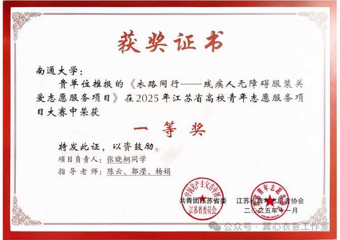 9 月,捷报再传!团队申报的《衣路同行 —— 残疾人无障碍服装关爱志愿服务项目》,凭借专业化的项目设计、系统化的服务流程和高效的执行能力,在 2025 年江苏省高校青年志愿服务项目大赛中斩获一等奖,成为省内高校志愿服务的标杆项目。
